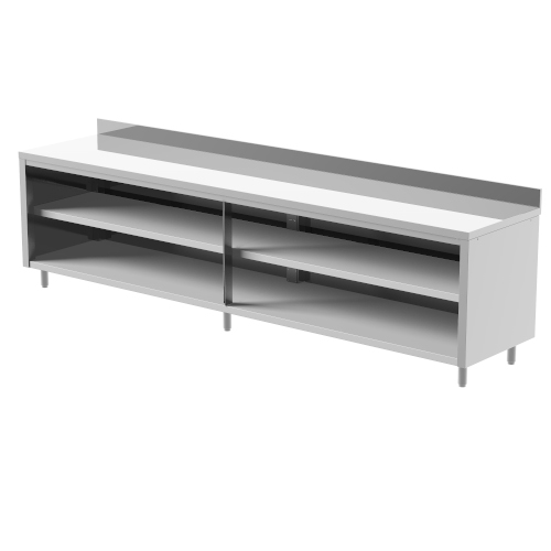 Sie sind seitlich geschlossen mit verstellbaren Füßen H. 14/18 ausgestattet. Erhältlich sind offene Modelle, mit Schiebe- und Durchgangstüren, mit und ohne Aufkantung. Zur weiteren Verstärkung der Struktur werden bei Längen über 210 cm standardmäßig sechs Füße mitgeliefert. Die Schiebetüren sind abnehmbar für eine einfache Reinigung unter voller Berücksichtigung der Hygienevorschriften.