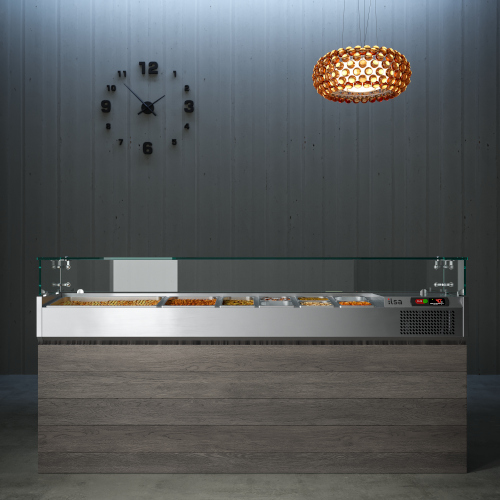 These equipment not only complete the functionality of a pizza counter, but can also be used on their own, by placing them on top of preparation tables, by means of feet, wall brackets or risers, and choosing between 32 or 38 cm depths. In addition, they can be used without glasses or with flat or curved glasses and can hold different combinations of stainless steel or polycarbonate GN containers. The bowl is made of stainless steel with a scotch-brite satin exterior finish. The insulation is made of high-density polyurethane foam (40 kg/m3). In addition, the motor is on the right as standard but can be supplied on the left on request.