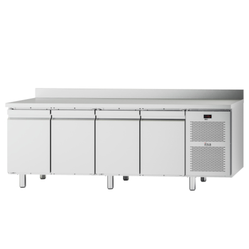 Les nouvelles tables réfrigérées NEOS sont construites avec une structure monocoque en acier inox AISI 304. Finition extérieure scotch-brite satinée ; épaisseur d’isolation de 60 mm pour le corps et de 50 mm pour les portes avec mousse à haute densité (40 kg/mc) ; dos extérieur en tôle galvanisée, en option en acier inox scotch-brite AISI 304 ; pieds en acier inox réglables en hauteur h. 140/230 mm ; chambre froide avec coins arrondis pour un meilleur nettoyage intérieur ; portes à fermeture automatique avec arrêt à 95° ; joints magnétiques des portes et des tiroirs facilement remplaçables ; groupe frigorifique monobloc ; système de ventilation canalisée à l’arrière pour une température interne parfaitement homogène ; dégivrage par gaz chauds et évaporation automatique de l’eau de condensation ; poignées ergonomiques ; compartiment technique en option à gauche dans les deux versions ; alimentation électrique standard 230V/50Hz ; gaz réfrigérant écologique R290 ; charnières supérieures et inférieures des portes fixées à l’avant du corps (interchangeables sans devoir démonter le plan de travail) ; portes réversibles.