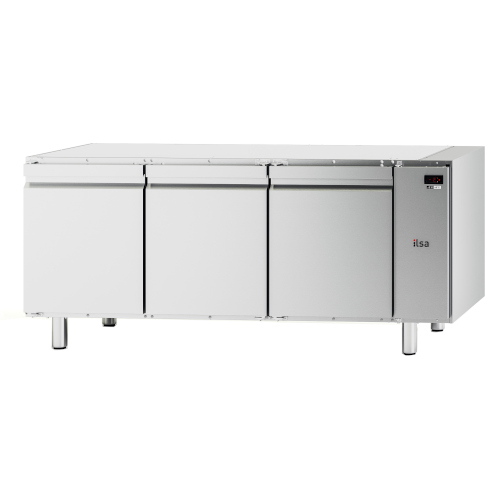 I nuovi tavoli refrigerati NEOS sono costruiti con una struttura a monoscocca in acciaio inox AISI 304. Finitura esterna satinata scotch-brite; spessore di isolamento di 60mm per la scocca e 50mm per le porte con schiumatura ad alta densità (40 kg/mc); schiena esterna in lamiera zincata, optional in acciaio inox AISI 304 scotch-brite; piedini in acciaio inox regolabili in altezza H 140/230mm; cella con angoli arrotondati per una migliore pulizia interna; porte auto-chiudenti con fermo a 95°; guarnizioni magnetiche porta e cassetti facilmente sostituibili; sbrinamento a sosta ed evaporazione automatica dell’acqua di condensa; maniglie ergonomiche; opzionale il vano tecnico a sinistra; alimentazione standard 220-240V 50/60Hz; gas refrigerante R134a; cerniere porte superiori ed inferiori fissate frontalmente sulla scocca (intercambiabili senza dover togliere il piano di lavoro); porte reversibili.