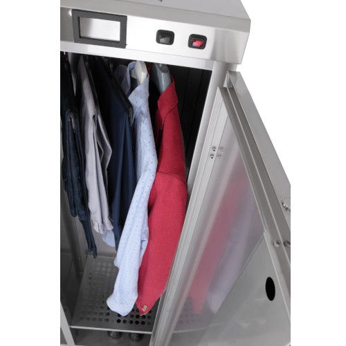 Una spia rossa, posta sul cruscotto, indica che il processo di sanificazione è in corso. Dopo circa 10 minuti, la fase di ozonizzazione dei vestiti è completata. Dopo 20 minuti circa il periodo di sanificazione è terminato e la spia rossa è spenta. Ora la porta può essere riaperta e gli indumenti, perfettamente sanificati, possono essere ritirati.